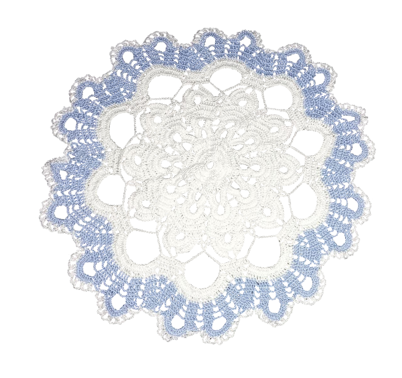Tapete para centro de mesa elaborado totalmente a mano en los colores blanco y azul con hilo algodón mercerizado y 47cm de radio