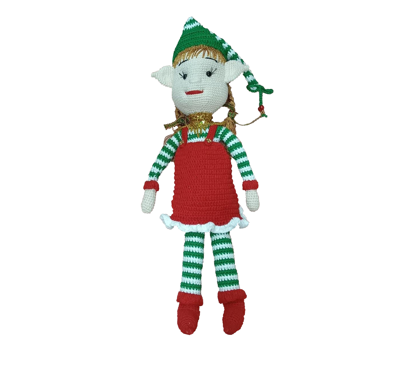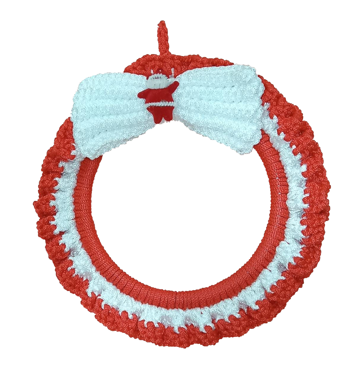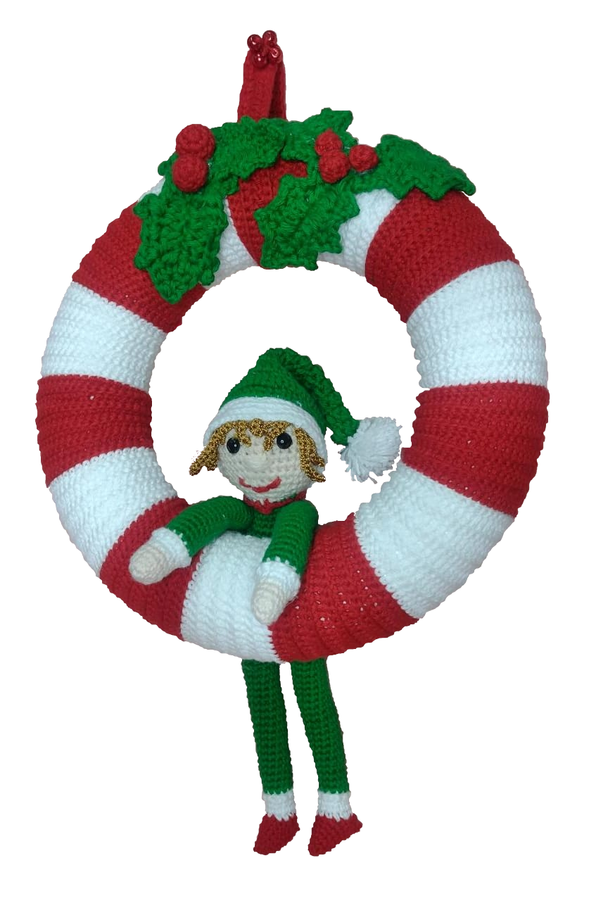 Elaborado a mano en su totalidad, hilo 100% algodon con 27cm de radio. Tiene franjas rojas y blancas con muerdagos navideños en la parte superior y un duende elfo amigurumi