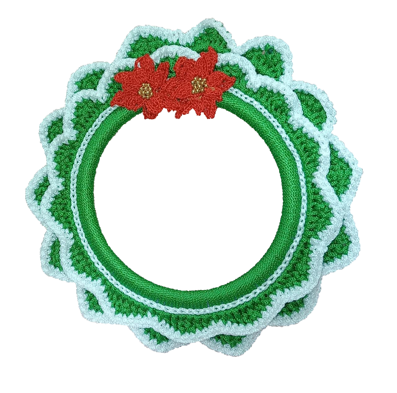 Elaborado a mano en su totalidad con los colores verde y blanco, tiene dos rosas rojas en la parte superior y 32cm de radio