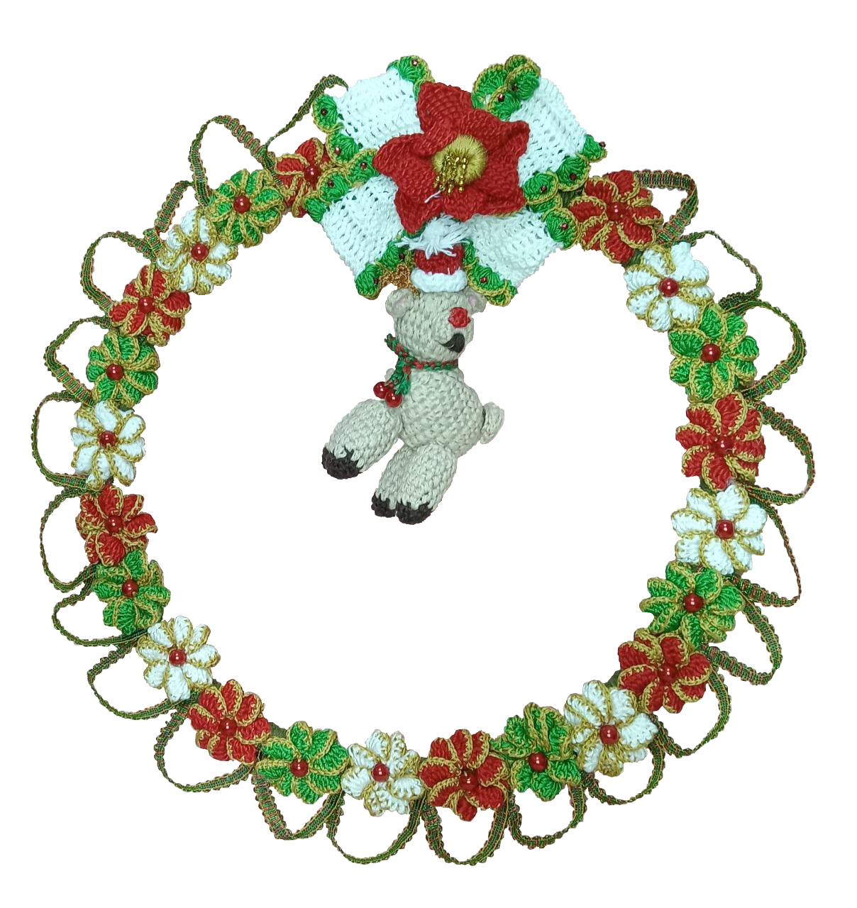 Elaborado a mano en su totalidad con hilo 100% algodón. Tiene 36cm de radio con diseños de 22 rosas en colores rojo, blanco y verde. Asimismo tiene un oso amigurumi, lazo y rosa